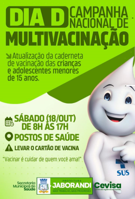 Dia D da Campanha Nacional de Multivacinação, A Campanha Nacional de Multivacinação realiza seu Dia D neste sábado, 18 de outubro. O atendimento será estendido, funcionando das 8h às 17h, em todos os Postos de Saúde. O principal objetivo é a atualização da caderneta de vacinação de crianças e adolescentes menores de 15 anos. Importante: Pais e responsáveis devem levar a caderneta de vacinação. Mensagem: "Vacinar é cuidar de quem você ama!"