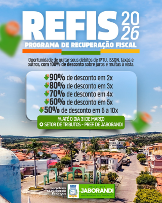 O Município de Jaborandi informa que está disponível o Programa de Recuperação Fiscal, destinado à regularização de débitos de IPTU, ISSQN, taxas e outros tributos municipais. Os contribuintes poderão quitar seus débitos com 100% de desconto sobre juros e multas para pagamento à vista. Também estão disponíveis condições especiais para parcelamento, conforme: 90% de desconto em até 2 parcelas 80% de desconto em até 3 parcelas 70% de desconto em até 4 parcelas 60% de desconto em até 5 parcelas 50% de desconto em 6 a 10 parcelas. O prazo para adesão vai até 31 de março. Os interessados devem procurar o Setor de Tributos da Prefeitura de Jaborandi para mais informações e formalização do acordo.